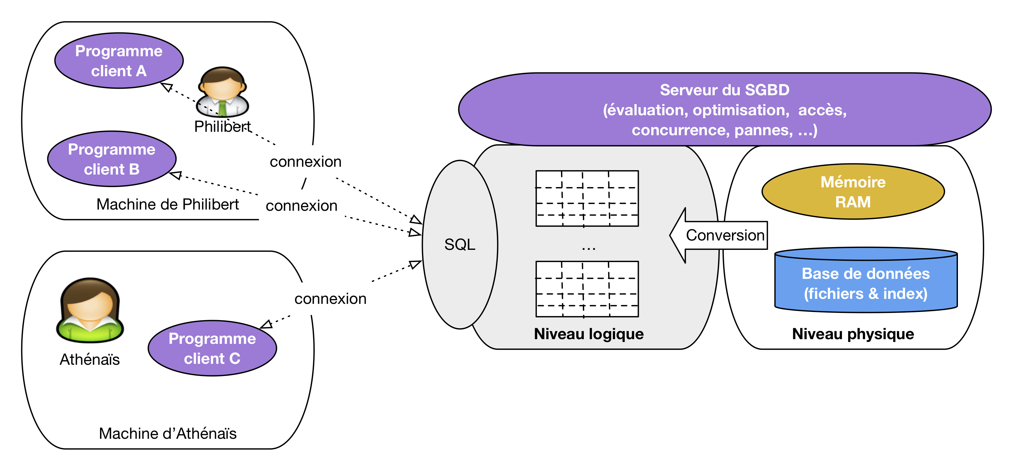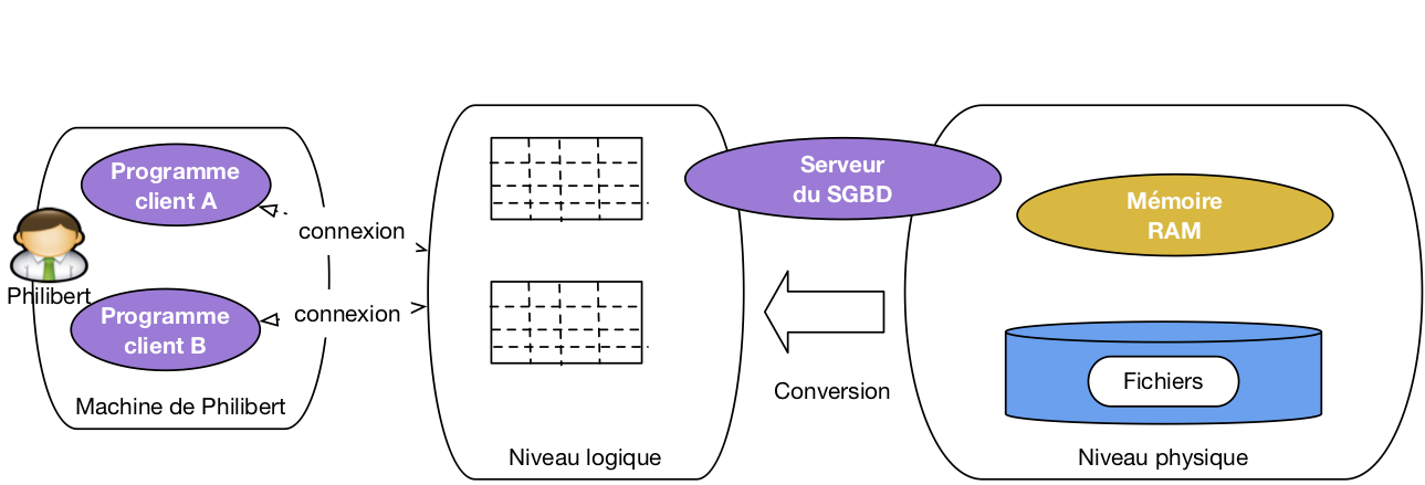 La figure ci-dessous illustre les niveaux d’abstraction dans l’architecture d’un système de gestion de données. Les programmes clients ne voient que le niveau logique, c’est-à-dire des tables. Le serveur est chargé du niveau physique, de la conversion des données vers le niveau logique, et de toute la machinerie qui permet de faire fonctionner le système : mémoire, disques, algorithmes et structures de données. Tout cela est, encore une fois, invisible (et c’est tant mieux) pour les programmes clients qui peuvent se concentrer sur l’accès à des données présentées le plus simplement possible.