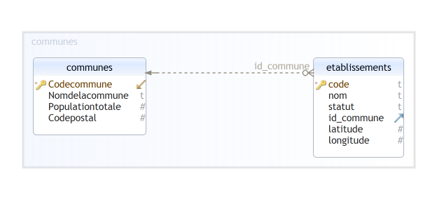 - etablissements(code: TEXT, nom: TEXT, statut: TEXT, #id_commune: INT, latitude: FLOAT, longitude: FLOAT)