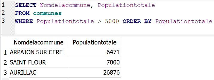 WHERE Populationtotale > 5000 ORDER BY PopulationtotaleCette requête affiche le nom et la population des communes de plus de 5000 habitants dans l’ordre croissant de leur population.