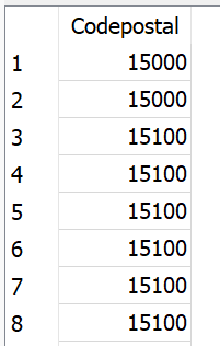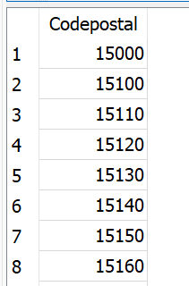 ORDER BY codepostalNous voyons que les codes postaux sont répétés autant de fois qu’il y a de communes desservies par ce code postal.