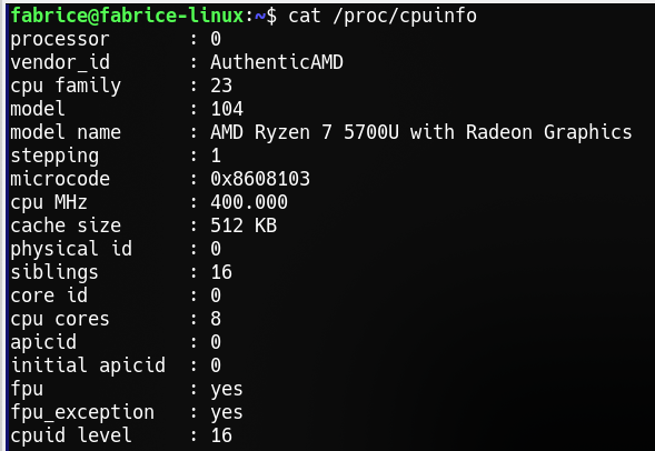 La commande cat /proc/cpuinfo permet d’avoir des informations détaillées sur le processeur.