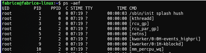 ps -aef(attention à l’espace après ps).S’affichent plusieurs informations sur les processus en cours sur votre ordinateur du type :