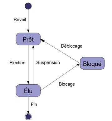 L’ordonnanceur (qui fait partie du système d’exploitation), divise le temps de processeur disponible en petits laps de temps (quantum de temps) et, à chaque intervalle, il peut faire passer un processus de l’état elu à prêt ou inversement.