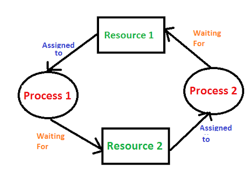- un processus Proc1 détient une ressource R1 et attend autre ressource R2 qui est utilisée par un autre processus Proc2