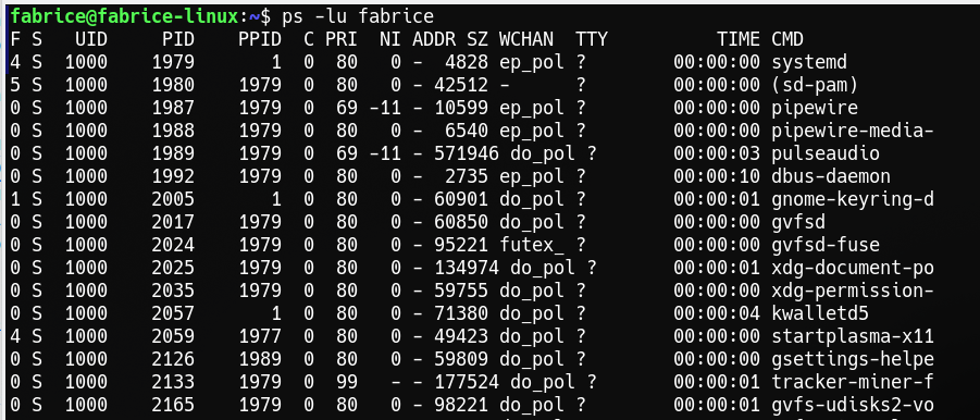 Dans un terminal Linux, la commande ps permet d’afficher la liste des processus actifs.