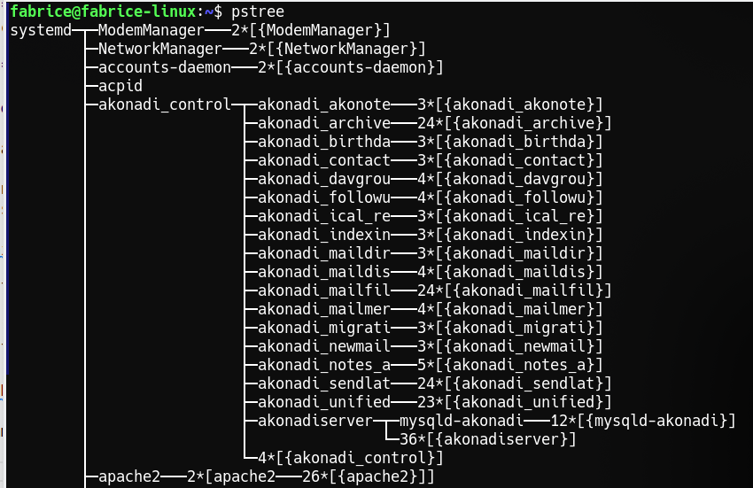La commande pstree permet d’afficher les processus sous forme d’arbre :