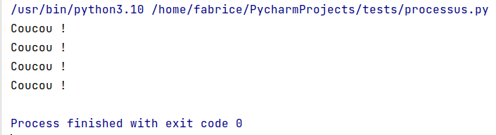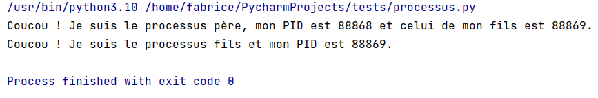 print(f"Coucou ! Je suis le processus fils et mon PID est {pid}.")