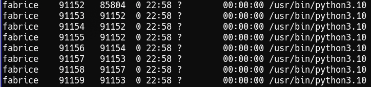 En exécutant plusieurs fois ce programme, nous constatons que les sorties ne se font pas toujours dans le même ordre. En général, l’ordre d’exécution ne peut pas être prévu à l’avance et plus il y a de processus, avec une durée longue, plus l’entrelacement est important. On dit que l’ordonnancement est non déterministe.