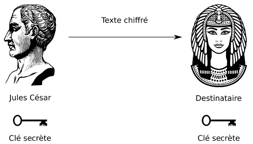 Jules César et son destinataire utilisent la même clef de chiffrement et elle n’est connue que par eux. Ce chiffrement est donc symétrique et cette clef est la clef partagée.