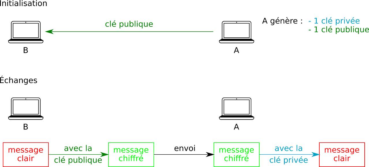 Plus précisément, dans une communication, lorsqu’on chiffre un message avec un algorithme asymétrique, on utilise la clef publique du destinataire. Le message ou les données ne sont alors déchiffrables que par la personne qui possède l’autre clef du couple, normalement la clef privée du destinataire. Contrairement à la clef publique, la clef privée n’est jamais diffusée.