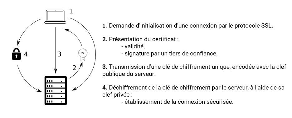 Pour résoudre ces problèmes, HTTPS utilise la suite de protocoles SSL/TLS qui met en jeu les 3 principes vus précédemment : signature numérique, cryptographie asymétrique et cryptographie symétrique.