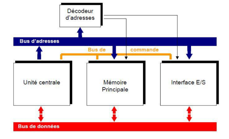 Pour que les données circulent entre les différentes parties d’un ordinateur (mémoire, CPU et les entrées/sorties), il existe des systèmes de communication appelés bus ( c’est le squelette de l’architecture). Il en existe de 3 grands types :